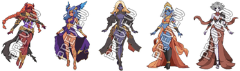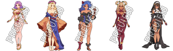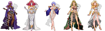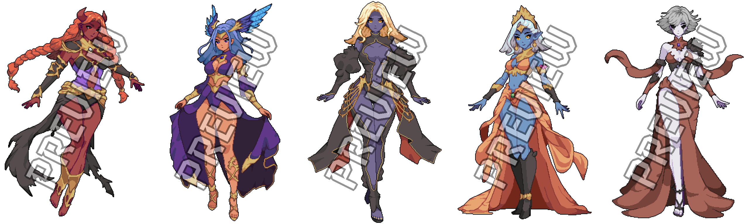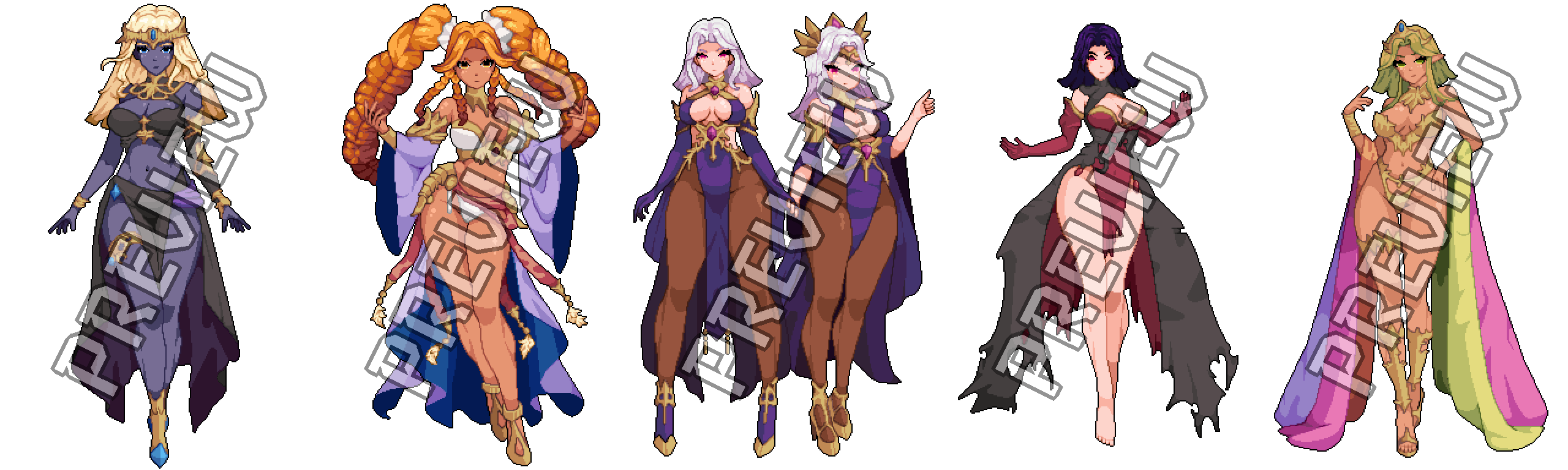 A collection of 5 pixel art goddesses for each packs, each designed with unique colors, flowing robes, and divine crowns. The pack captures a mix of elegance, power, and celestial beauty in a simple pixel style.